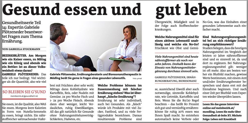 „Meine Lebensmittelunverträglichkeit (Histamin) durch den Wechsel verursacht, konnte durch die kompetente Behandlung von Frau Plötzeneder in wenigen Sitzungen behoben werden. Müdigkeit und Heißhunger wurden auch in Kombination mit Ernährungsberatung nach den Sitzungen stark reduziert und sind merklich besser geworden. Die Kombination von Bioresonanz und Ernährungsberatung ist für mich optimal, kurzfristig schnell Erfolg zu haben und langfristig beständig ein Ziel zu erreichen. Die äußerst achtsame und sehr zuvorkommende Beratung von Frau Plötzeneder in einer angenehmen Praxisatmosphäre sind dabei sehr wichtig.“ Sonja Mrkos, Baden